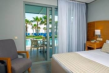 Junior Suite Sea Front with Sharing Pool is 248 square feet and includes a queen-size bed 150-154 width plus a sofa bed plus balcony, desk, satellite tv , cable tv, hairdryer, tea and coffee making facilities , safe, bathrobes, and slippers.